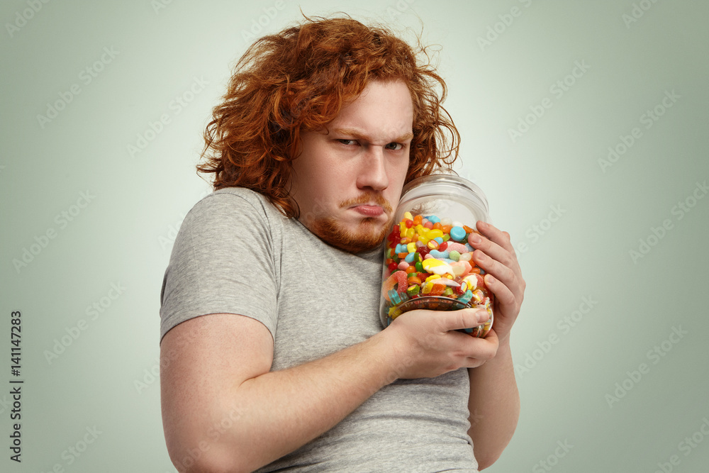 Obese Chubby European Man With Ginger Curly Hair Holding Jar Of Sweets Tight Having Greedy Look Frowning And Grimacing Posing Indoors At Studio Wall Obesity Gluttony And Unhealthy Lifestyle Stock Photo